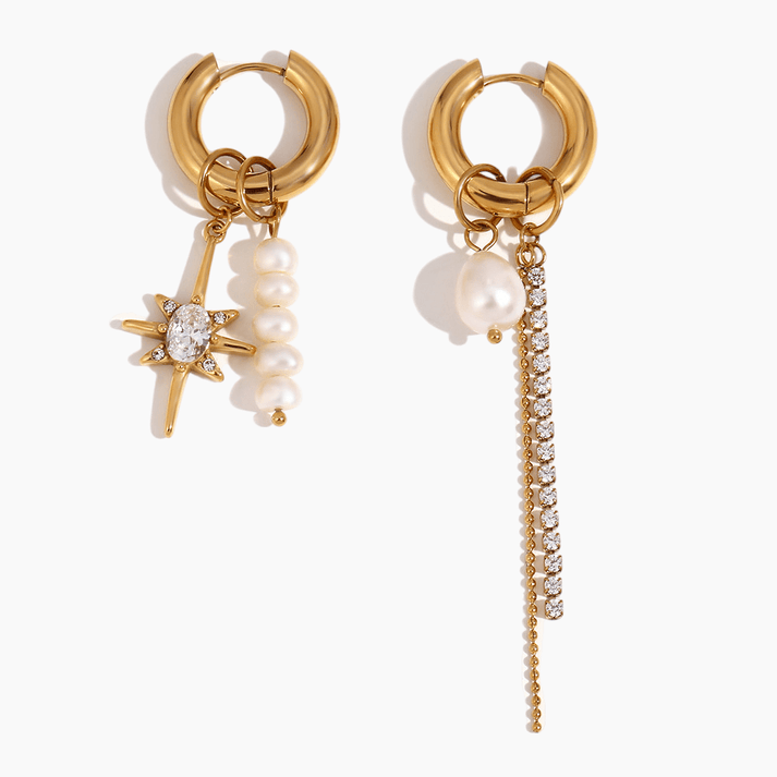 Shop Asymmetric Star & Pearl Earrings. Mismatched celestial hoops in 18K gold plated stainless steel. Tarnish-proof and perfect for sensitive ears. Shop now!