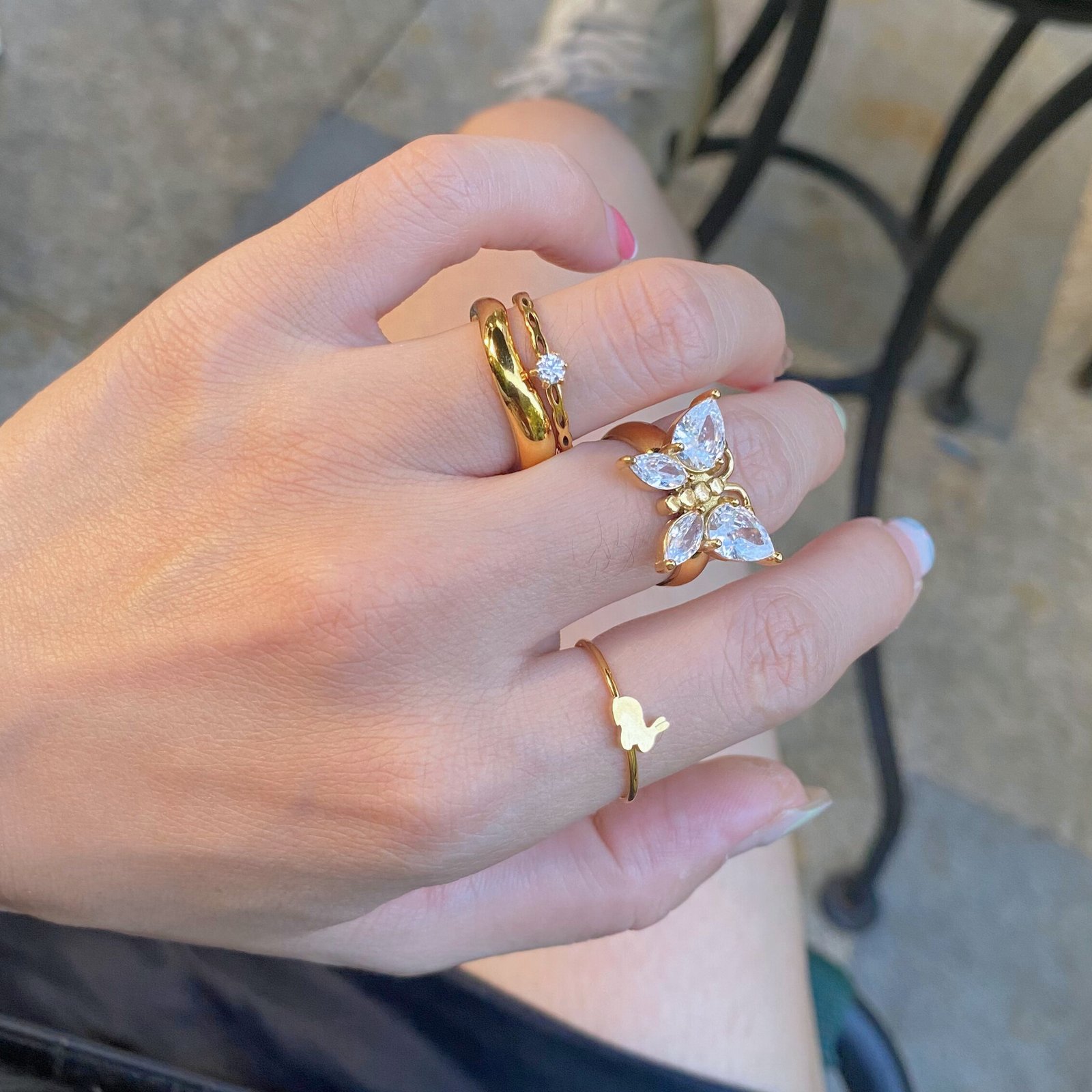 A dazzling butterfly CZ ring crafted from 18K gold plated stainless steel. Features marquise-cut cubic zirconia, waterproof and tarnish-resistant for daily wear.
