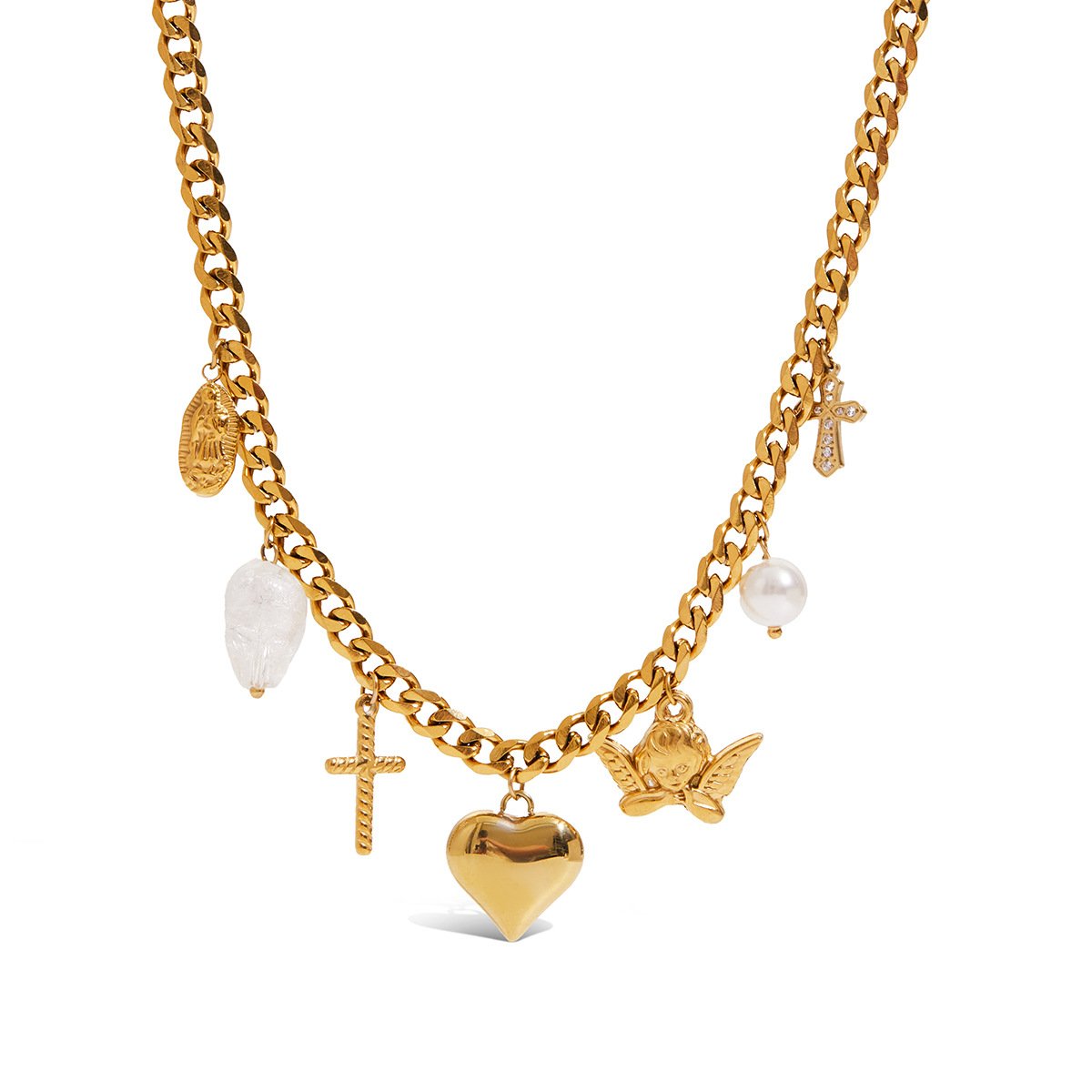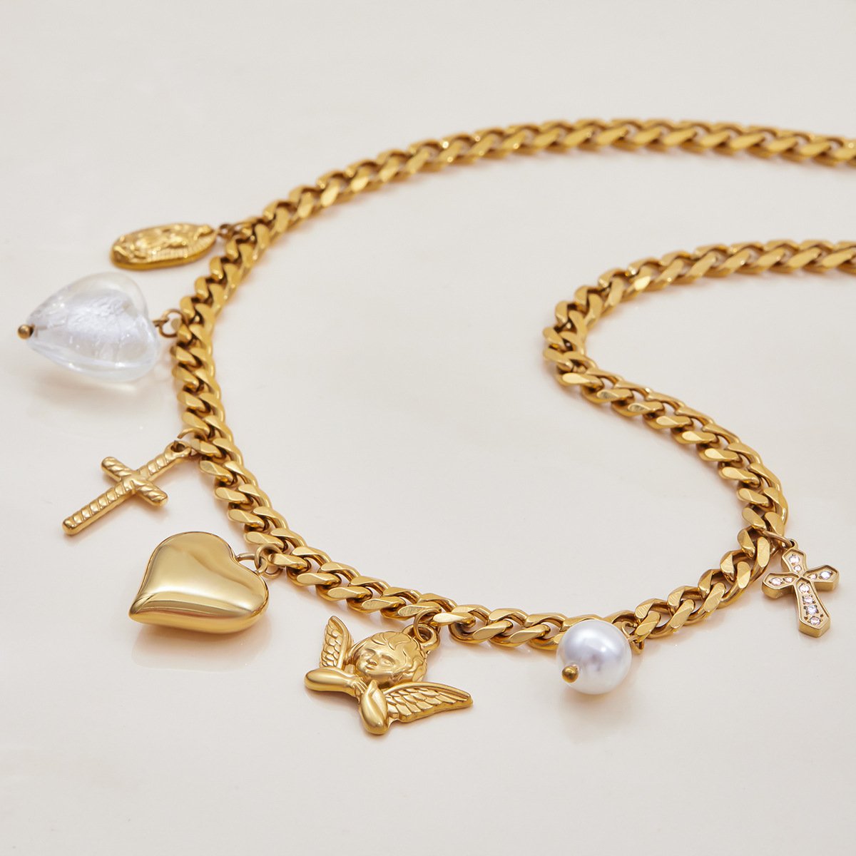 This 18K gold plated stainless steel charm necklace features a heart, angel pearl, cross, and Mary, creating a perfect balance of femininity and symbolism. Its thick chain design adds a bold yet elegant touch, making it an ideal statement piece for any occasion.