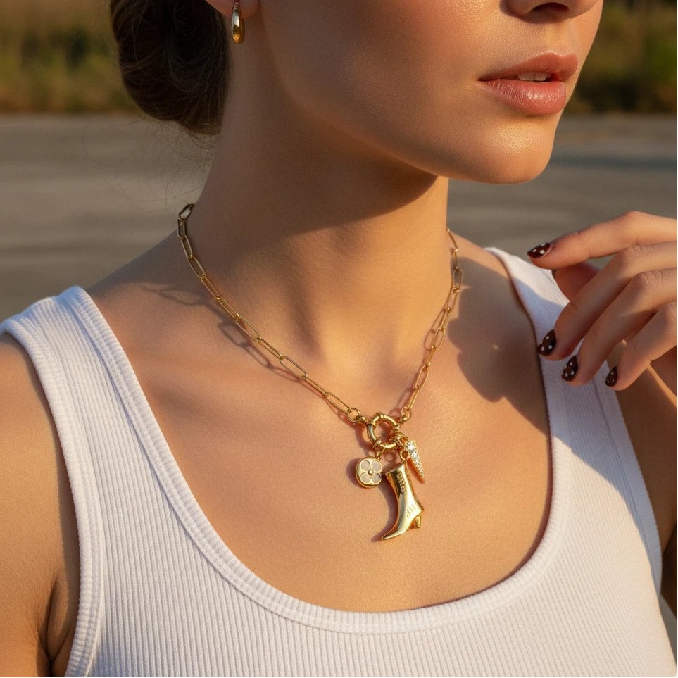 The Cassidy Charm Necklace is a modern cowboy boot necklace inspired by the spirit of the American West and designed for effortless everyday wear. It balances freedom, confidence, and western charm with a refined, city-ready edge.