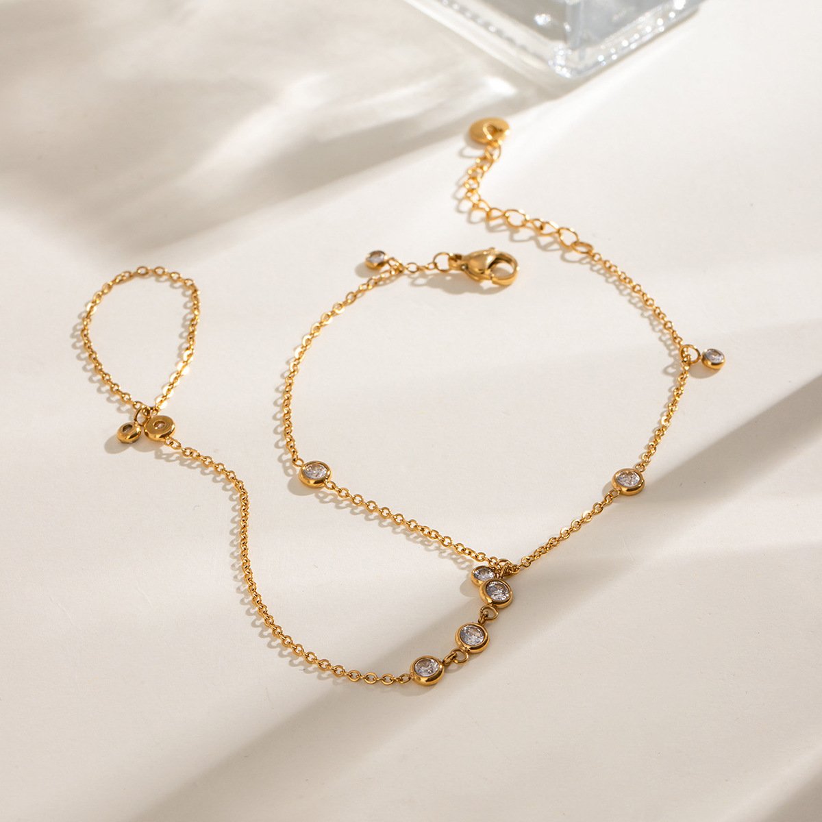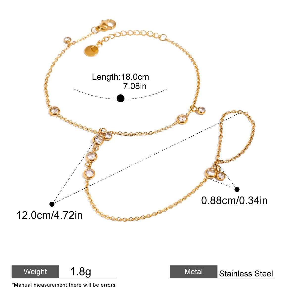 Elegant 18k gold plated diamond hand chain with a dainty bracelet and ring design. Waterproof, tarnish-resistant, and perfect for everyday wear or special occasions.