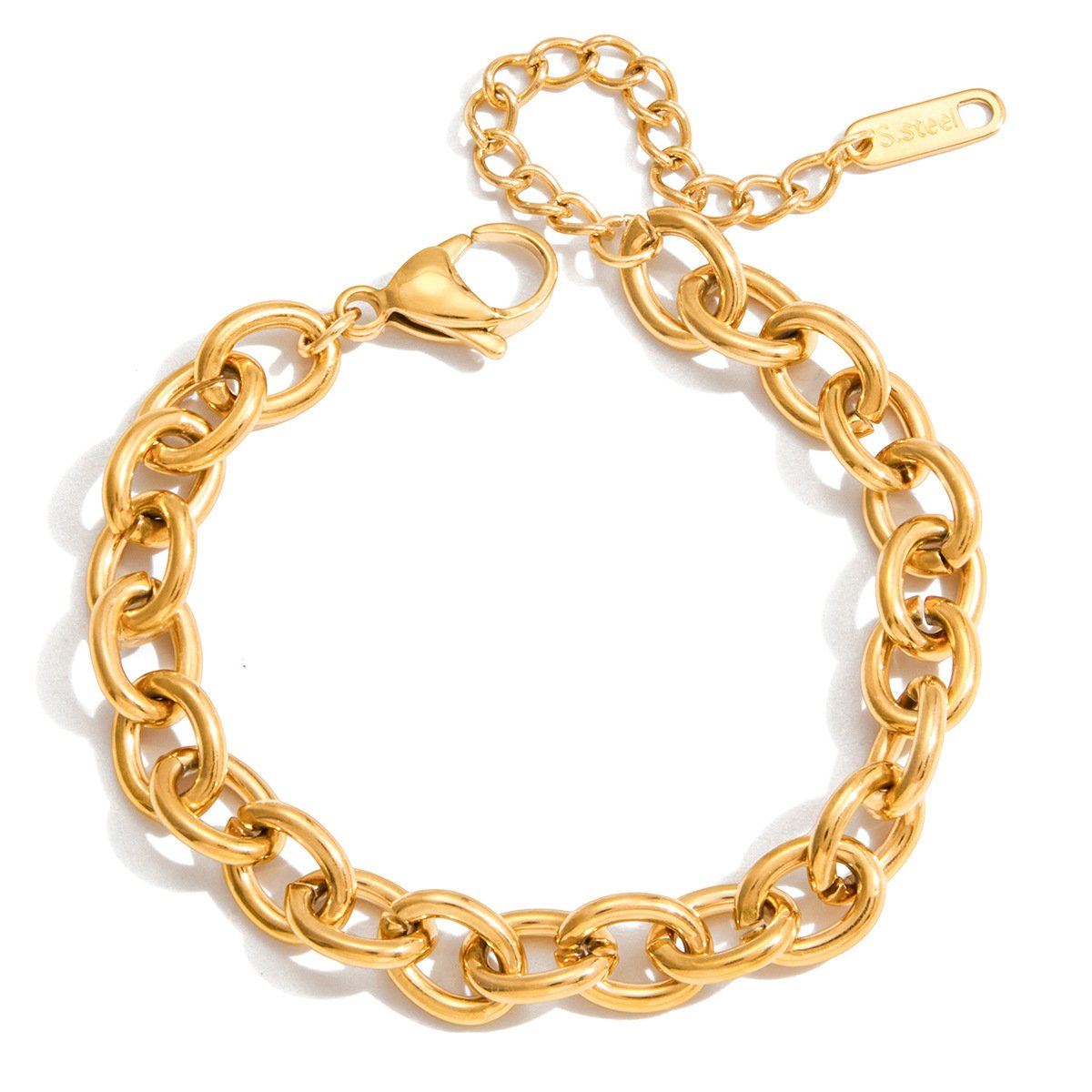 Create your perfect look with this large oval link gold chain bracelet. Durable, stylish, and ideal for customizing your own charm or pendant. Perfect for layering or wearing solo.