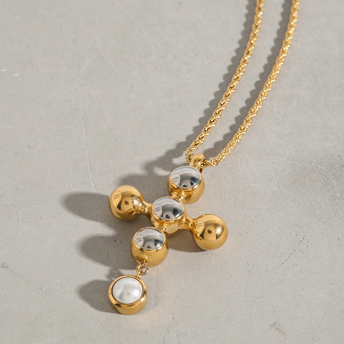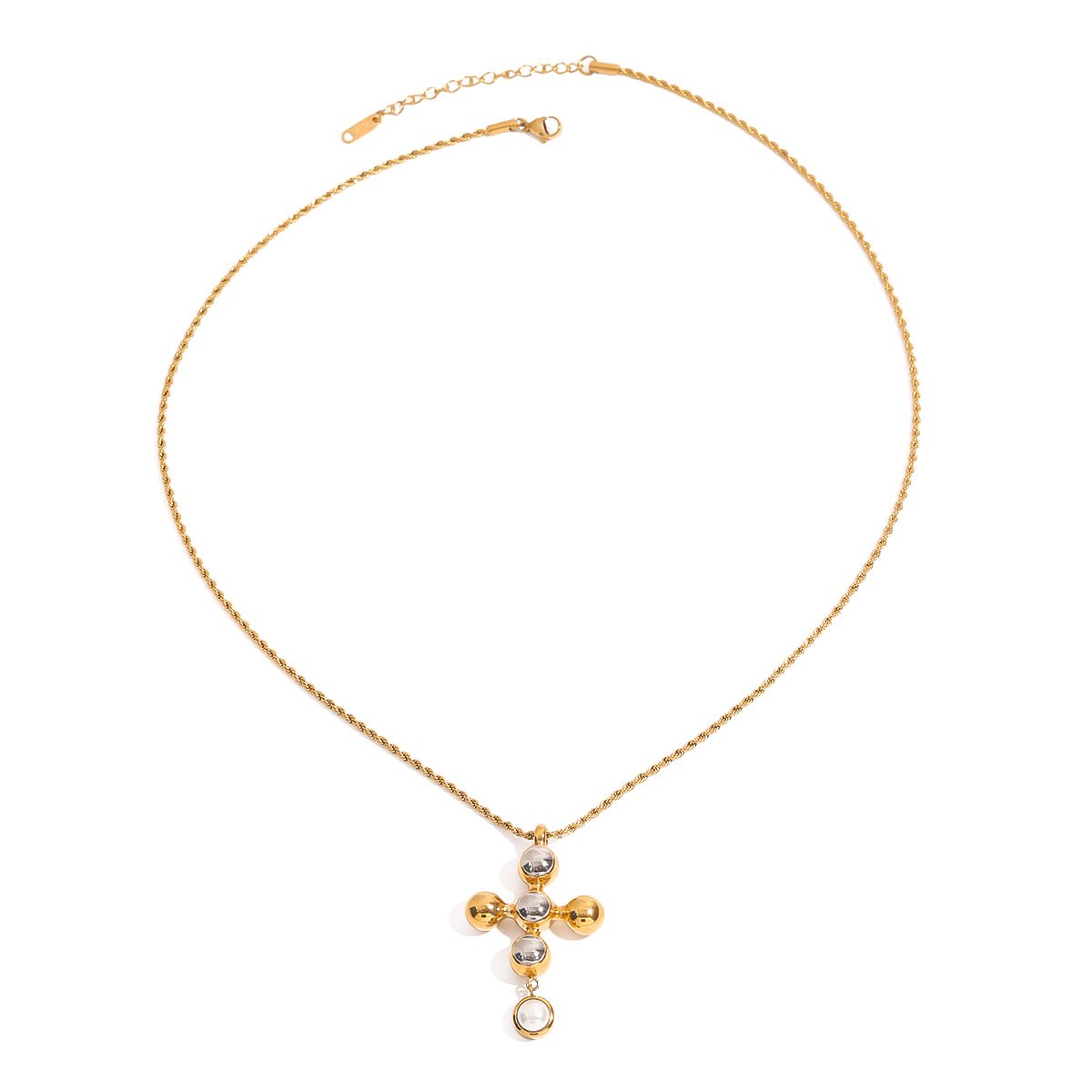 A modern orb cross pendant necklace crafted from 18K gold plated stainless steel and set with high-quality cubic zirconia. Tarnish-resistant, hypoallergenic, and perfect for everyday styling.