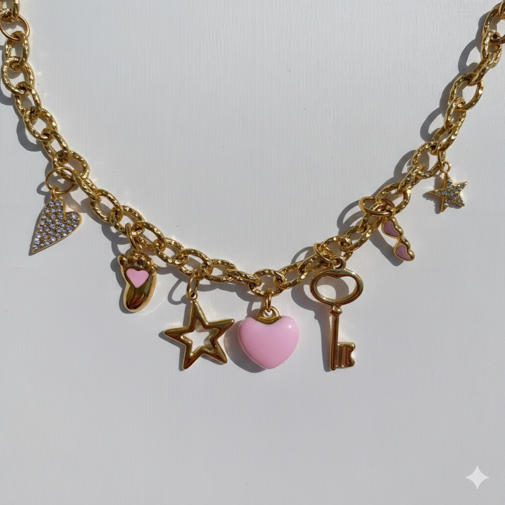 Shop the Pink Heart Charm Bracelet, featuring 7 unique charms in tarnish-free 18K gold plated stainless steel. Waterproof, romantic, and uniquely yours. Order this original design today!