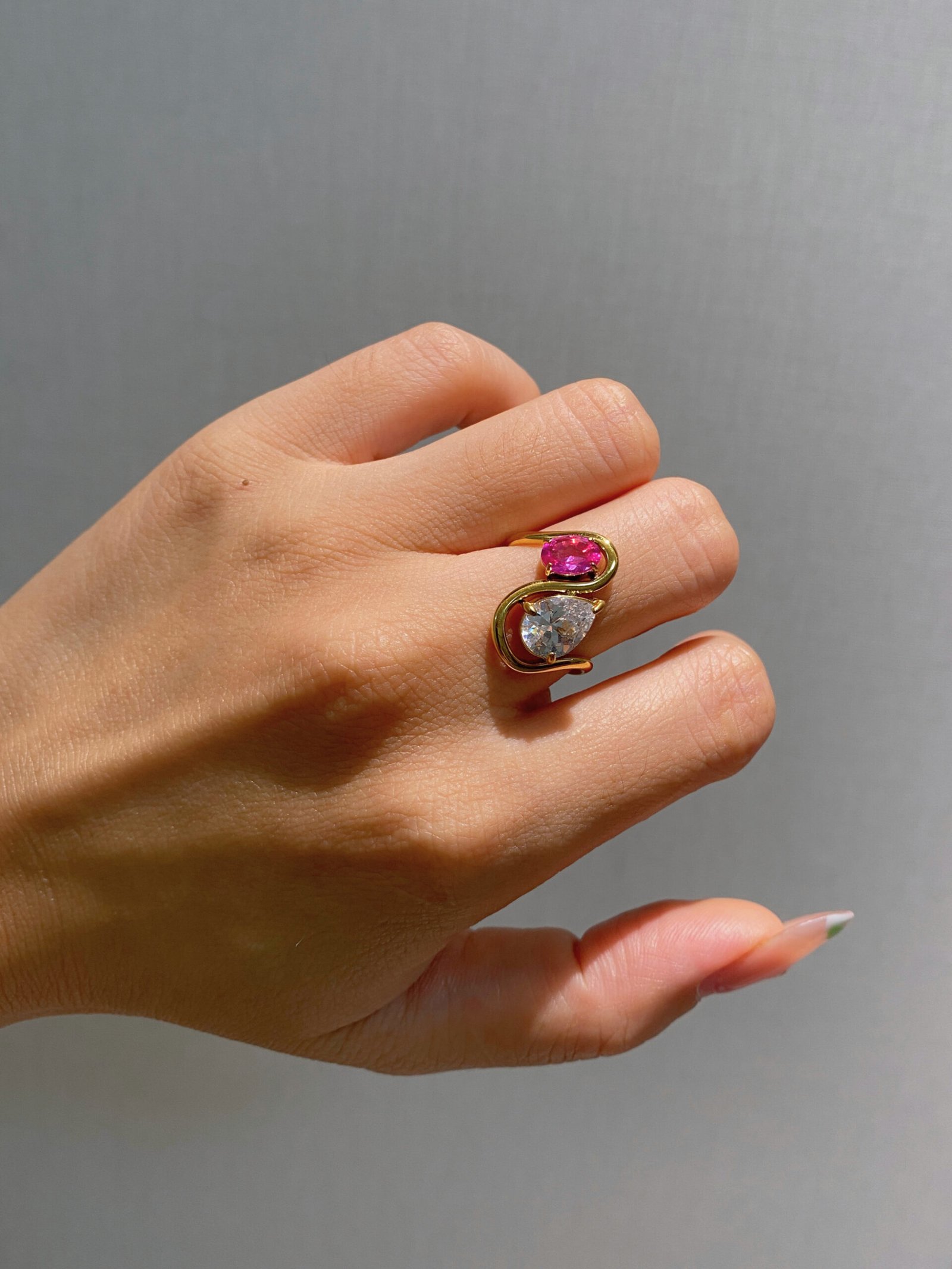 Make a subtle statement with the Rose Ring — a contemporary design that blends elegance with everyday wearability. Featuring a unique wrap silhouette, this two stone pink ring pairs a vibrant pink oval zircon with a brilliant pear-cut clear zircon, creating a soft contrast that catches light from every angle.