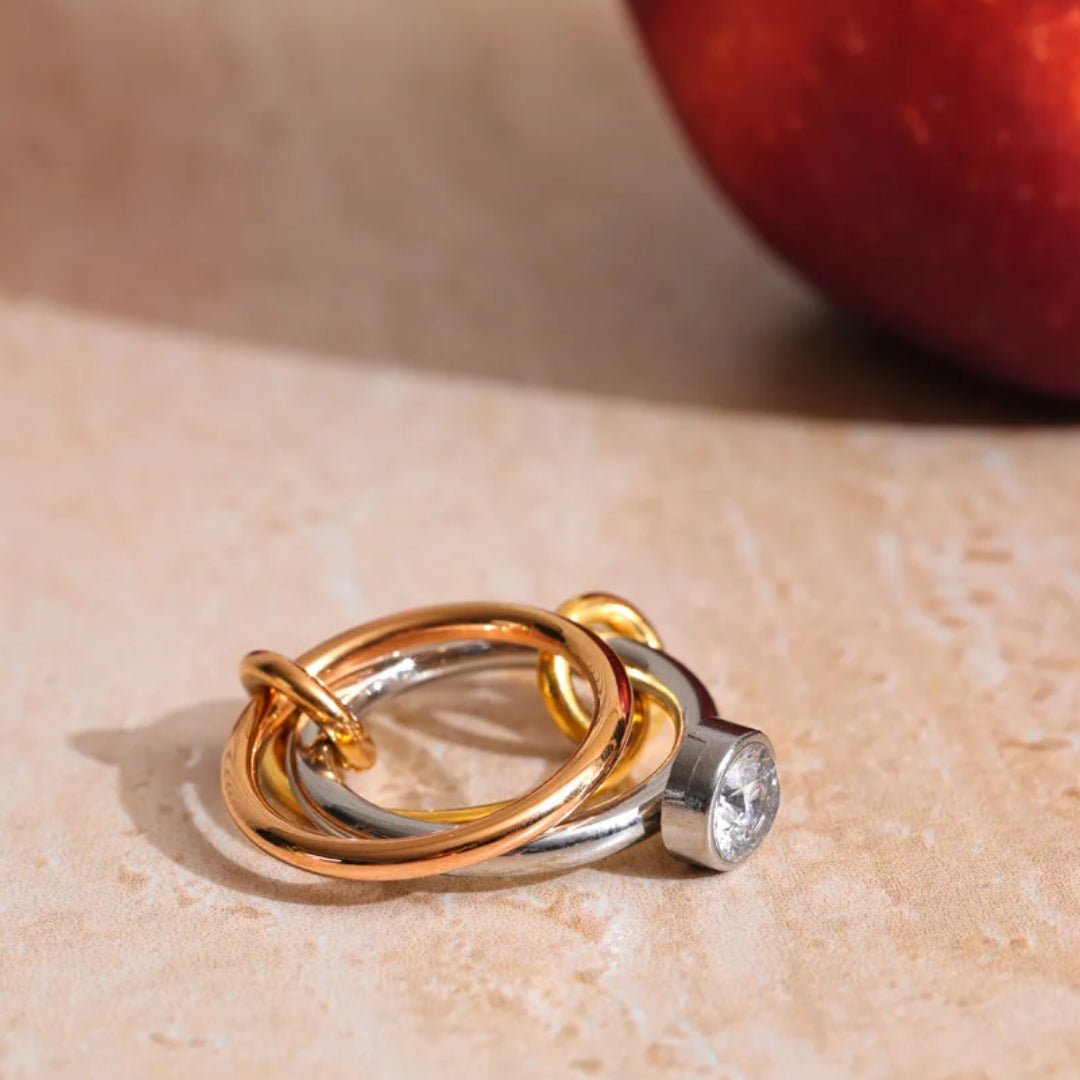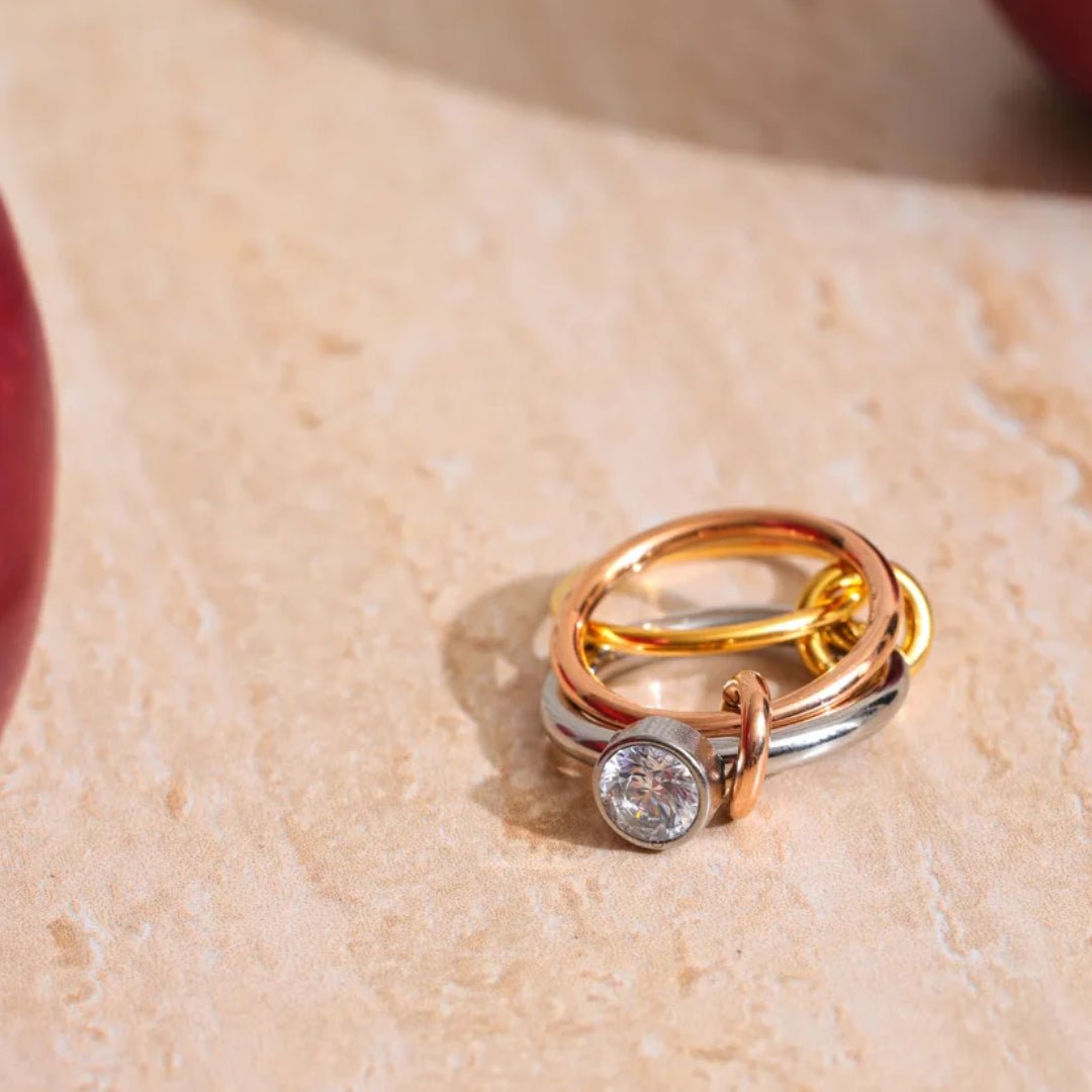 Discover a stylish tri-color stackable ring featuring gold, rose gold and silver tones with a sparkling CZ stone accent. A modern mixed metal fashion ring perfect for everyday wear or gifting.