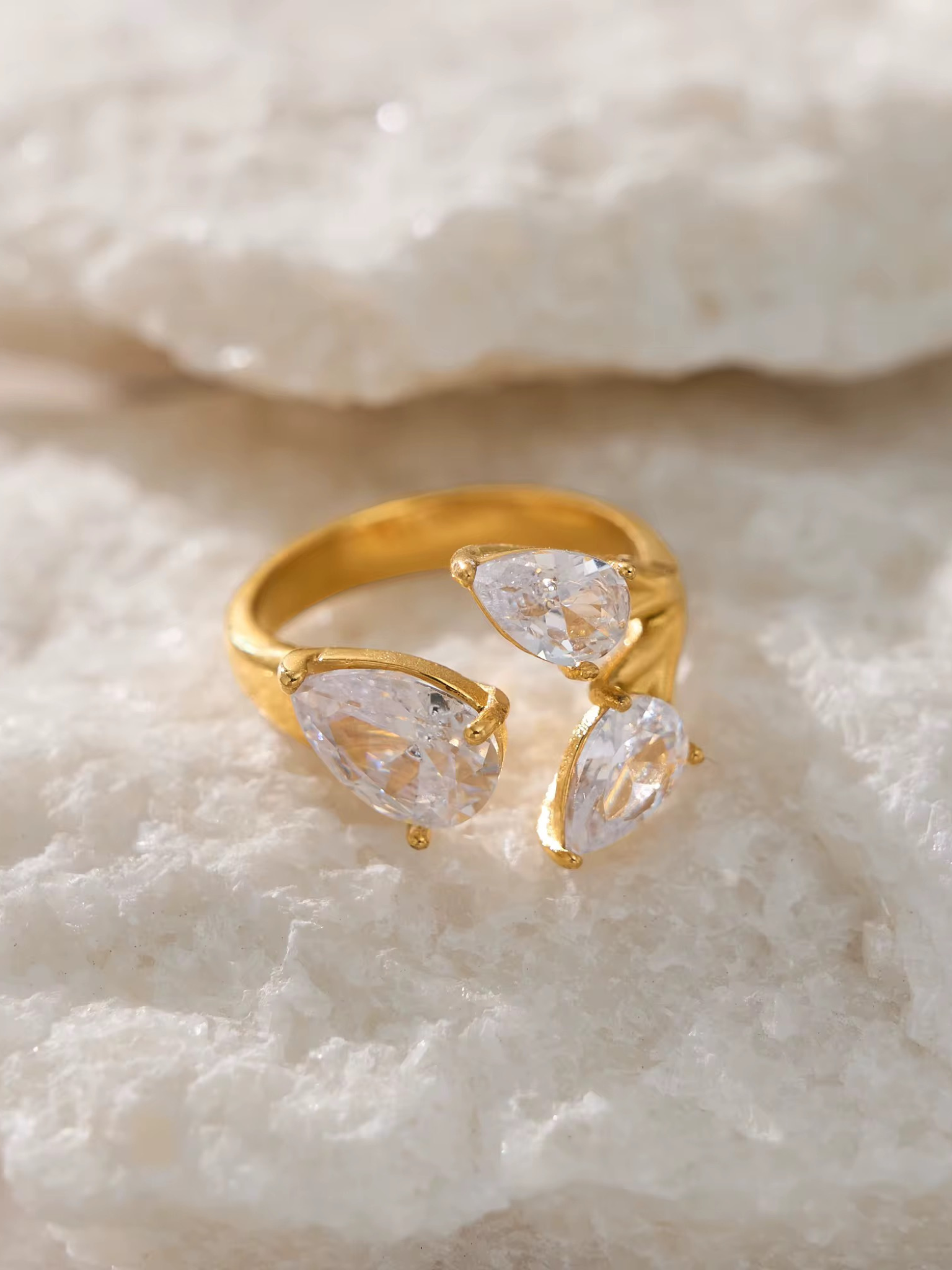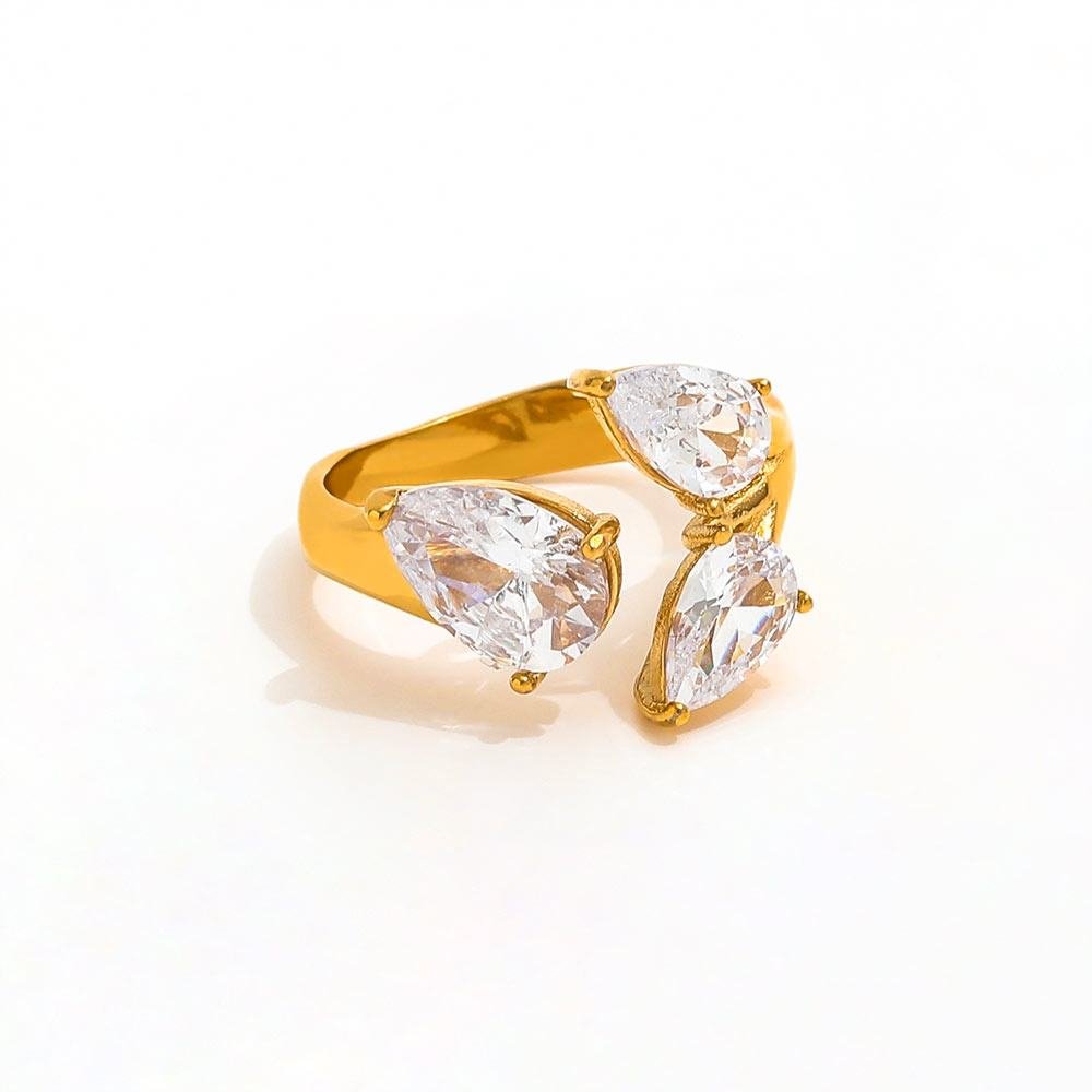 The Trinity Pear Ring is a bold gold statement ring made from 18K gold-plated stainless steel.
